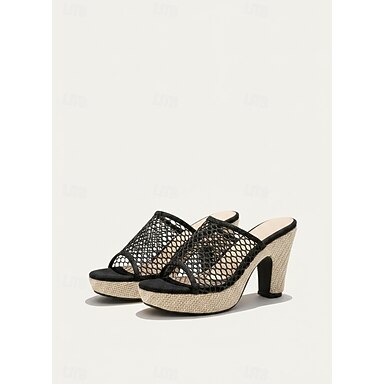Mules de plataforma color crema para mujer con hebilla dorada: elegantes sandalias de tacón de bloque tejido con punta abierta para vacaciones urbanas, paseos de verano y viajes a la moda.