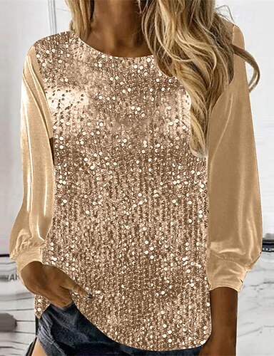 Mujer Camiseta Camiseta superior Lentejuelas Retazos Color sólido Moda Elegante Clásico Manga Larga Escote Redondo Tops regulares Diario Fin de semana Dorado Primavera Otoño