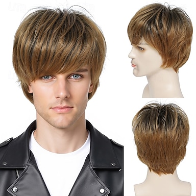 Pelucas sintéticas Recto Giro cúbico Bob corto Corte a capas Con flequillo Hecho a Máquina Peluca 10 pulgadas Marrón Claro Pelo sintético Hombre Clásico Cómodo Gradiente de Color Marrón