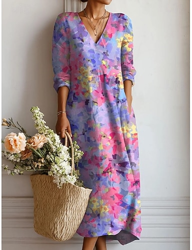 Vestido Midi de Mujer Pascua Lino Ligera Transpirable Vestido de Sol Corte A Vacaciones Casual Boho Vacaciones Ajuste Regular Floral Bloque de Color Manga Larga Cuello en V Marino Rojo Púrpura Claro