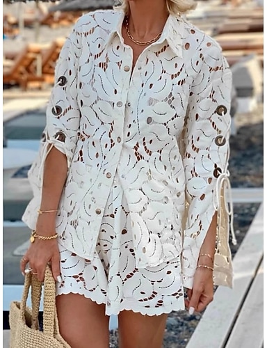 Mujer Conjuntos de pantalones cortos parte superior del bolero Manga Larga Cuello Alto Color sólido Encaje Agujero Moda Ropa de calle Casual Diario Exterior Blanco Verano Ajuste regular