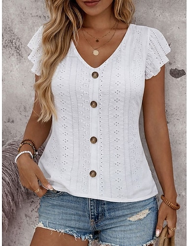 Mujer Camiseta Camiseta superior Volante Ojal Botones Plano Moda Elegante Clásico Manga Corta Escote en Pico Tops regulares Diario Noche Fin de semana Blanco Amarillo Rosa Azul cielo Verde Trébol