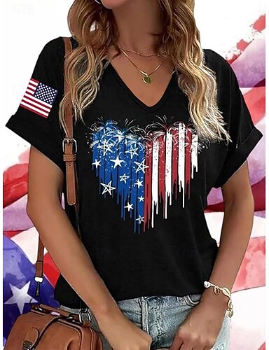 día de la independencia americana Mujer Camiseta Estampado Corazón Graphic Bandera estadounidense Vintage Elegante Clásico Manga Corta Escote en Pico Tops regulares Diario Fin de semana Ropa de