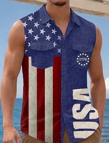 Hombre 4 de julio, 250 aniversario de Estados Unidos Bandera de EE. UU. Patriótico Camisa Abotonar la camisa Camisa sin mangas Sin Mangas Moda informal Festivos Verano Primavera Cuello Vuelto Dos