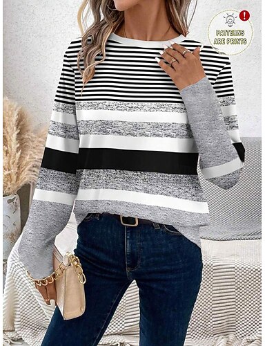 Camiseta de mujer de manga larga gráfica a rayas vintage elegante clásica de manga larga cuello redondo tops regulares impresión de fin de semana rosa azul caqui primavera otoño antes de otoño