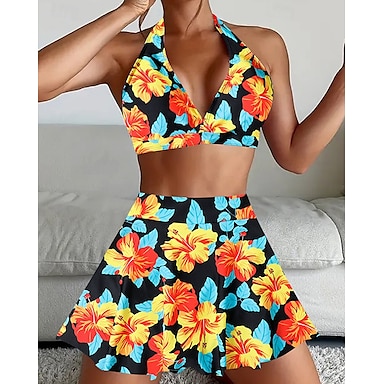 Mujer Tankini Traje de baño de dos piezas Espalda al Aire Bañadores Floral Bañadores Negro Amarillo Transpirable Secado rápido Ligero Sin Mangas - Natación Surf Playa Verano Primavera