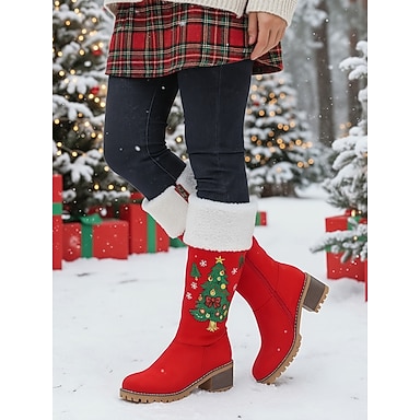 Botas altas rojas de mujer con bordado de árbol de Navidad: botas de invierno cálidas con forro de piel sintética, ideales para conjuntos navideños, fiestas de Navidad y actividades al aire libre.