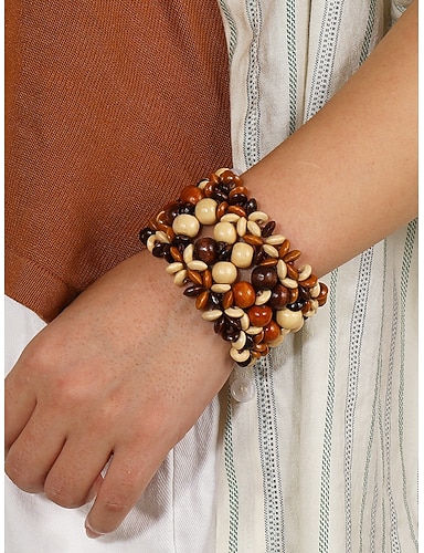 Pulsera de cuentas de madera hecha a mano para mujer: pulsera elástica gruesa bohemia, joyería de mujer de estilo étnico vintage natural, accesorios casuales y de playa