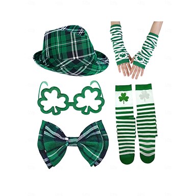Sombrero verde a cuadros para mujer, gafas con forma de trébol, guantes y pajarita para el Día de San Patricio. &Conjunto de calcetines a rayas: divertidos accesorios festivos para las celebraciones