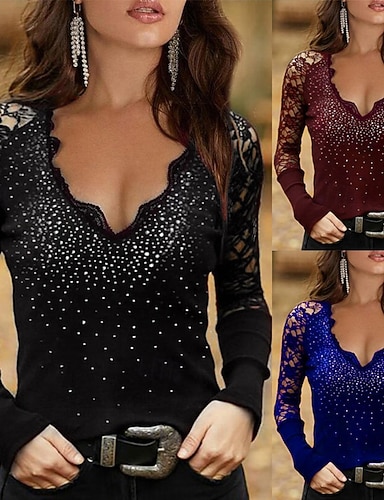 Mujer Blusa Encaje Retazos Color sólido Elegante Casual Manga Larga Escote en Pico Tops regulares Diario Azul Piscina Negro Vino Primavera Otoño Invierno