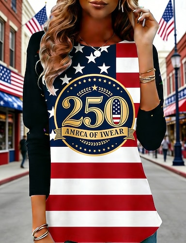 Mujer Camiseta Camiseta superior Estampado Graphic Bandera estadounidense Moda Elegante Clásico Manga Larga Cuello Barco Tops regulares Diario Fin de semana Ropa de vacaciones Azul Piscina Primavera