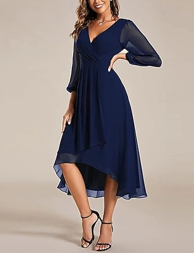 Vestido midi de mujer, vestido de gasa, vestido elegante, moda elegante, clásico, diario, playa, vacaciones, corte regular, liso, manga corta, cuello en V, azul, rosa, morado, verano, primavera