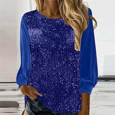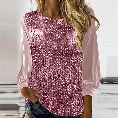 Mujer Camiseta Camiseta superior Lentejuelas Retazos Color sólido Vintage Moda Elegante Manga Larga Cuello Barco Escote Redondo Tops regulares Diario Fin de semana Gris Primavera Otoño