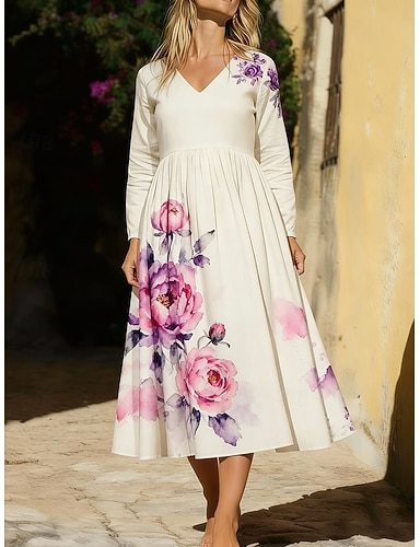 Mujer Vestido Midi Vestido bohemio Vestido informal Elegante Moda Diario Exterior Vacaciones Ajuste regular Floral Manga Larga Escote en Pico Blanco Verano Primavera Otoño