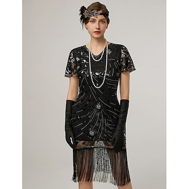 Rugido 20s 1920s Hasta la Rodilla Vestido Flapper El gran Gatsby Chica de la aleta Lentejuelas Franja Escote en Pico Disfraz Mujer Navidad Carnaval Fiesta de Noche Mascarada Fiesta temática retro