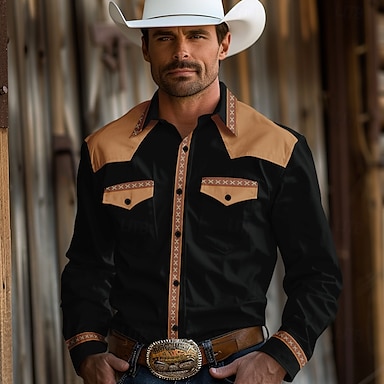 Hombre Cowboy camisa occidental Abotonar la camisa Camisa vaquera Manga Larga Vintage occidental Diario Festivos Primavera verano Otoño Invierno Cuello Vuelto Camisas con cuello Impresión 3D Negro
