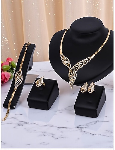 Conjunto de joyas para mujer bañadas en oro con pedrería, elegante collar de 4 piezas, pulsera y pendientes. &Juego de anillos para fiestas, bodas &eventos nocturnos