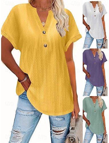 Mujer Camiseta Blusa Camiseta superior Retazos Botones Plano Elegante Vacaciones Moda Manga Corta Escote en Pico Tops regulares Diario Festivos Noche Negro Blanco Amarillo Rosa Vino Verano Primavera