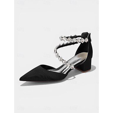 Zapatos de tacón grueso con tira de pedrería negra para mujer - elegantes zapatos de cóctel con punta afilada para fiestas