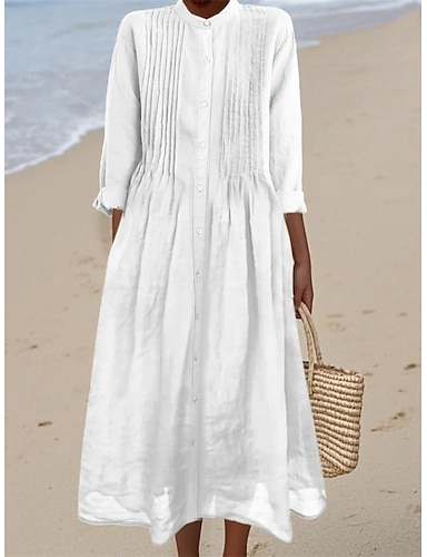 Vestido camisero midi para mujer, vestido informal de lino y algodón sintético, vestido de corte A, moda básica, moderna, para uso diario, vacaciones, salidas, corte regular, liso, manga larga, cuello