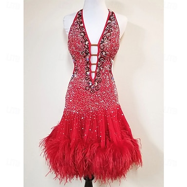 Vestido de baile latino para mujer, rojo, con diamantes de imitación, escote en V profundo, dobladillo de plumas, sexy, sin espalda, para salsa, cha cha, rumba, competición, disfraz de actuación