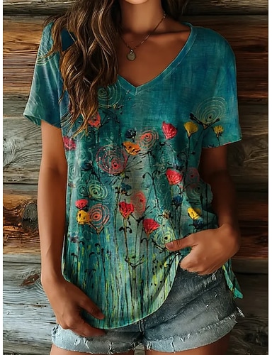 Mujer Camiseta Estampado Floral Graphic Plantas Vintage Moda Hawaiano Manga Corta Escote en Pico Tops regulares Diario Noche Fin de semana Azul Piscina Púrpula Claro Marrón Verde Trébol Verano