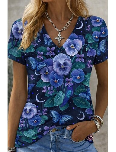 Mujer Camiseta Estampado Floral Graphic Moda Elegante Moderno Manga Corta Escote en Pico Tops regulares Diario Fin de semana Azul Piscina Rosa Vino Rosa Brillante Gris Verano Primavera