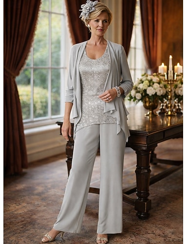 Traje pantalón largo hasta el suelo Vestido de la madre de la novia Manga tres cuartos Cuello redondo Elegante Simple Invitada de boda con color sólido