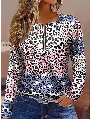 Mujer Camiseta Cremallera Estampado Ombre Graphic Leopardo Elegante Vintage Clásico Manga Larga Escote en Pico Tops regulares Diario Fin de semana Rosa Primavera Otoño