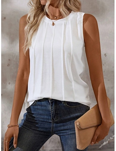 Mujer Camiseta sin mangas Frunce Plano Moda Elegante Clásico Sin Mangas Cuello Barco Tops regulares Diario Noche Fin de semana Blanco Verde Ejército Azul Marino Verano Primavera