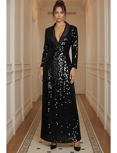 Mujer Vestido de esmoquin Corte A Formal Satén Lentejuelas Elegante Manga Larga Hasta el Suelo Solapa de Pico Diseño Botonadura Doble
