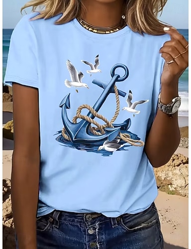 Mujer Camiseta Estampado Graphic Ancla Vintage Elegante Clásico Manga Corta Cuello Barco Tops regulares Diario Fin de semana Azul Piscina Blanco Verano Primavera