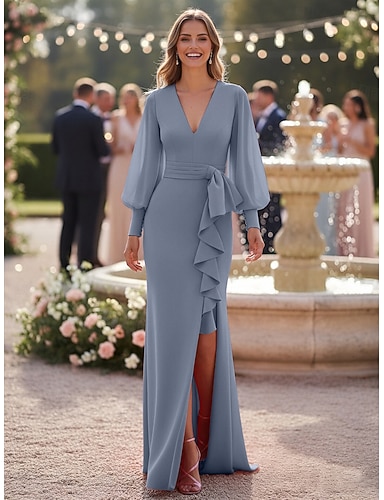 Funda Columna Hasta el Suelo Vestido Invitada Boda Vestido formal Vestido de noche Vestido de Madrina Manga Larga Escote en Pico Elegante Sencillo Formal Invitado a la boda Fiesta de Pedida de Mano