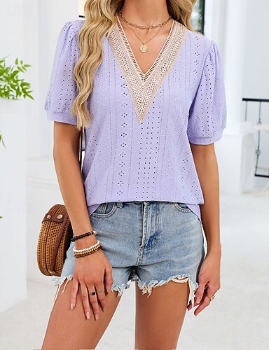 Mujer Camiseta Tops de verano Retazos Ojal Color sólido Elegante Moda Clásico Manga Corta Escote en Pico Tops regulares Diario Noche Fin de semana Azul Piscina Negro Blanco Rosa Morado Verano