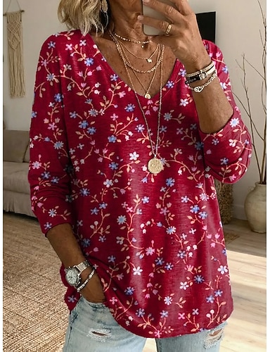 Mujer Camiseta Estampado Graphic Plantas Vintage Elegante Clásico Manga Larga Escote en Pico Tops regulares Diario Rojo Morado Verano Primavera