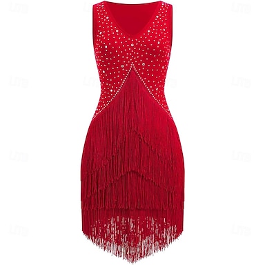Vestido de baile latino para mujer, con flecos rojos y diamantes de imitación, escote en V profundo, para competición, cha cha samba, rumba y jive.