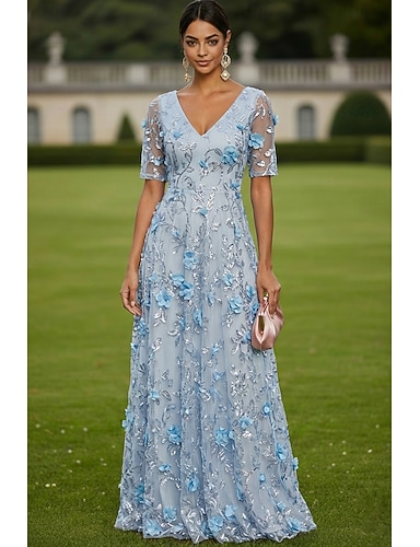 Vestido de invitada de boda largo hasta el tobillo estilo A Línea Vestidos formales Vestido de gala Vestido de la madre de la novia Manga tres cuartos Cuello en V Talla grande Brilla y resplandece