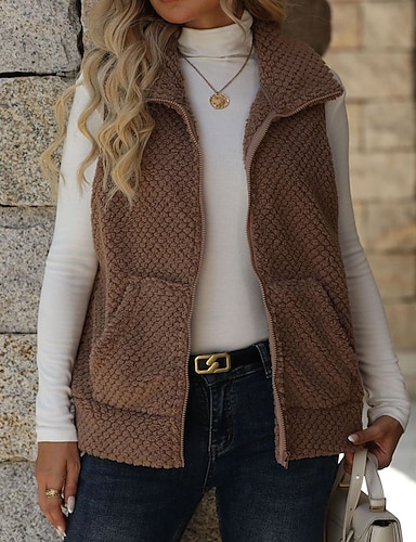 Mujer Abrigo de invierno Chaleco polar Chaleco Mantiene abrigado Cómodo Retazos Cremallera Bolsillo Moda Casual Color sólido Vacaciones Calle Casual Ropa Cotidiana Regular Cuello Vuelto Ajuste regular