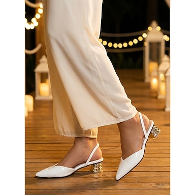 Zapatos de tacón bajo blancos con tira trasera y detalle de tacón apilado metalizado para mujer, elegantes zapatos para la madre de la novia para bodas en la ciudad, zapatos de vestir de punta para la