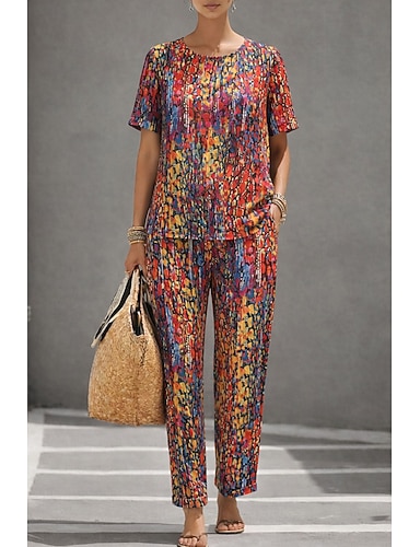 Mujer Conjuntos de lino y algodón Manga Corta Escote Redondo Graphic Abstracto Elegante Bohemia Activo Casual Diario Azul Piscina Rojo Morado Verano Ajuste regular