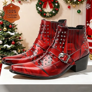 Botines rojos de piel auténtica con tachuelas y detalle de hebilla para hombre: un calzado navideño atrevido para una moda navideña inspirada en el rock.