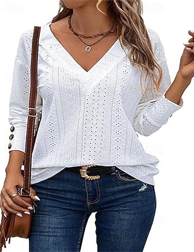 Mujer Blusa con textura Parte superior con ojales Camiseta de punto Camiseta Encaje Retazos Ojal Color sólido Elegante Moda Clásico Manga Larga Escote en Pico Tops regulares Casual Diario Playa Negro