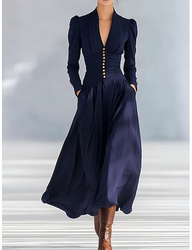 Mujer Vestido largo maxi Vestido de lino de algodón Elegante Moda Diario Exterior Vacaciones Delgado Plano Manga Larga Escote en Pico Negro Blanco Vino Azul Marino Primavera Otoño