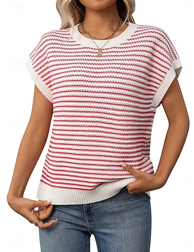 Mujer Pulóveres Pull-over Elegante Moda Ropa de calle Bloque de color Cuello Barco Retazos De Punto Mangas cortas Tops regulares Tejer Diario Exterior Fin de semana Negro Blanco Verano Primavera