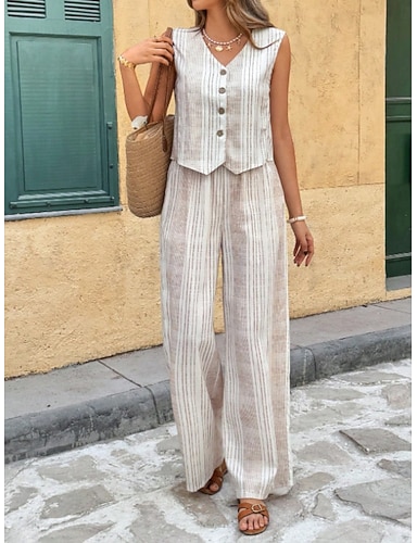 Mujer Conjuntos de dos piezas Chaleco Conjuntos de pantalones Sin Mangas Escote en Pico A Rayas Moda Ropa de calle Casual Diario Exterior Rosa Caqui Verano Ajuste regular