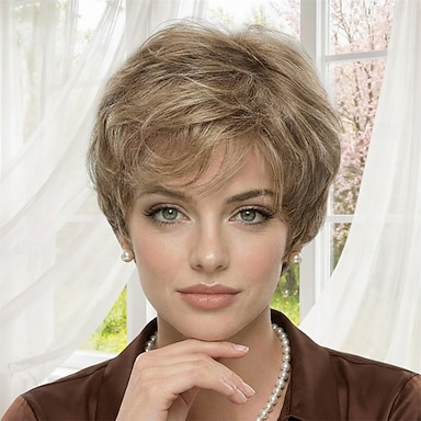 Peluca rubia corta y elegante para mujer: corte pixie esponjoso con textura natural.