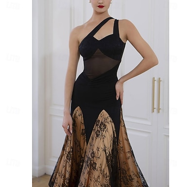 Vestido de baile de salón para mujer, de gasa negra, de malla, manga larga, elegante, para vals, tango, foxtrot, competición