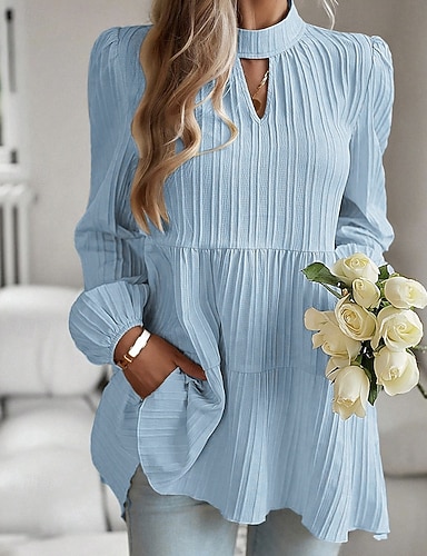 Mujer Blusa Plisado Ojal Color sólido Plano Elegante Básico Casual Manga Larga Cuello Alto Collar mandarín Tops regulares Diario Festivos Azul cielo Verano Primavera Otoño