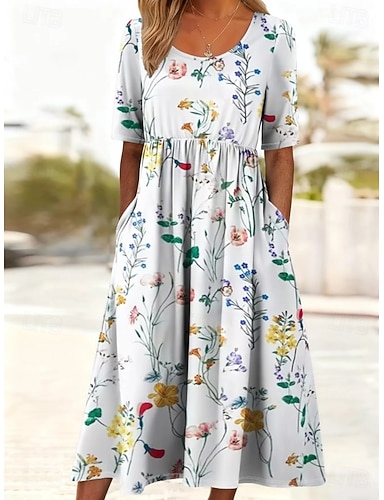 Mujer Vestido Midi Vestido de cambio Vestido de verano Vacaciones Casual Diario Ajuste regular Floral Graphic Manga Corta Cuello Barco Azul Piscina Blanco Rosa Azul cielo Verano Primavera