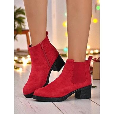Botines rojos con cremallera para mujer: elegantes botines de ante sintético con tacón de bloque para Navidad, la oficina y salidas informales.